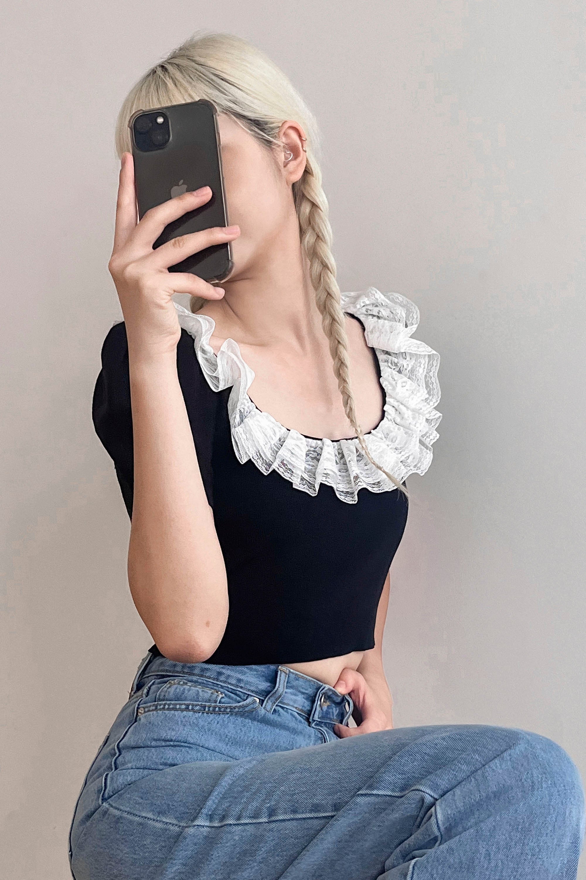 Ella Crop Knitted Top Rounded square neck with lace inset Puffed sleeves Cropped length Product Specification : 100% Acrylic Flat […]